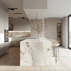 Cuisine en contreplaqué au design moderne haut de gamme personnalisé avec îlot de comptoir en marbre